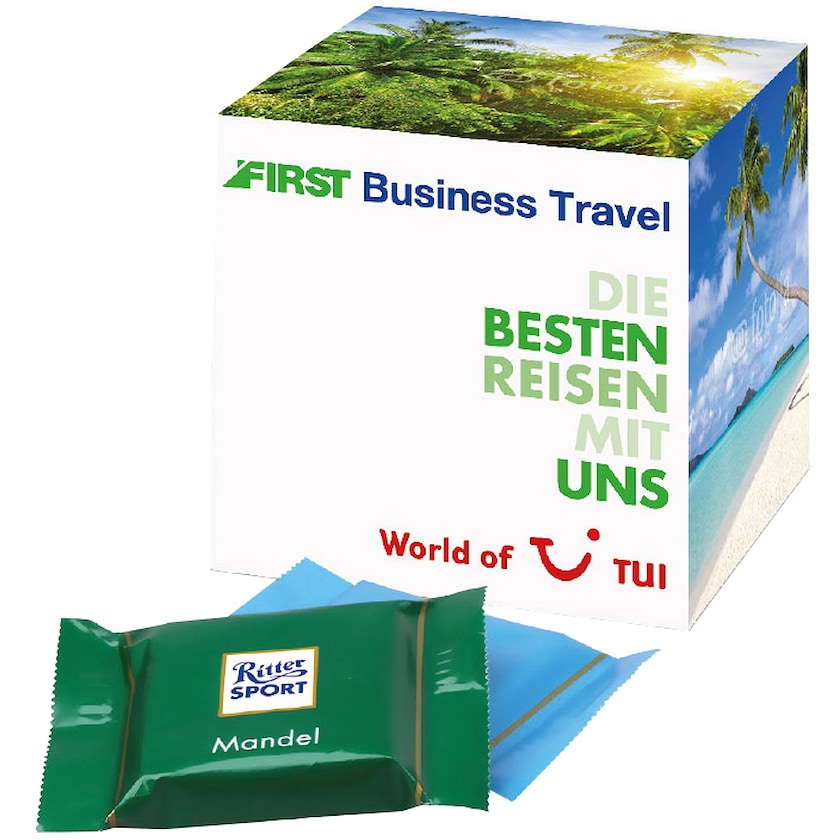 Kleine Pappschachtel mit 5 Ritter Sport Quadretties. Die Pappverpackung wird nach ihren Wünschen bedruckt. Die Schokoladenstückchen kommen in gemischten Geschmacksrichtungen (Alpenmilch, Halbbitter, Knusperflakes und Mandel).
