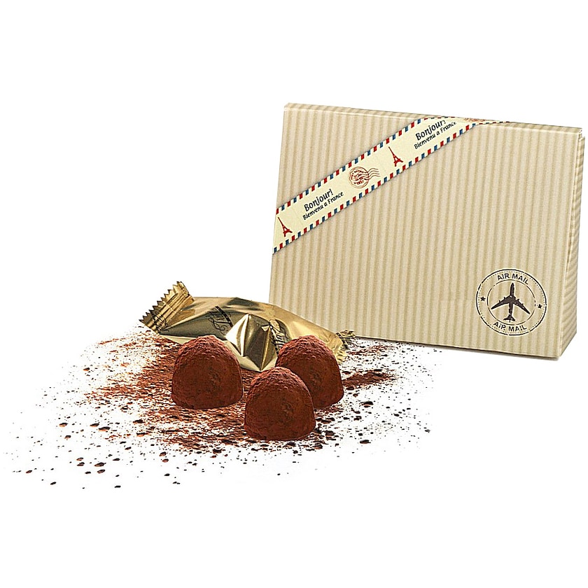 3 Schokoladentrüffel in einer Schachtel mit eigenem Logo. Die Schokoladentrüffel werden in Frankreich hergestellt und ist auch erstklassige dunkle Schokolade. Die Schachtel wird nach Ihrem Design bedruckt. Ein perfektes Geschenk für wichtige Kunden!