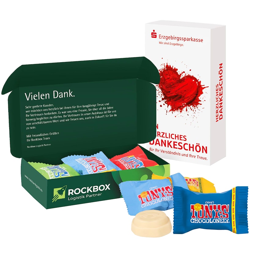 Pralinenschachtel gefüllt mit 6 Tiny Tony's von Tony's Chocolonely. Die Schokolade ist in verschiedenen Geschmacksrichtungen erhältlich, frei von Palmöl und Fairtrade-zertifiziert. Die gesamte Box wird nach Ihren Wünschen bedruckt.
