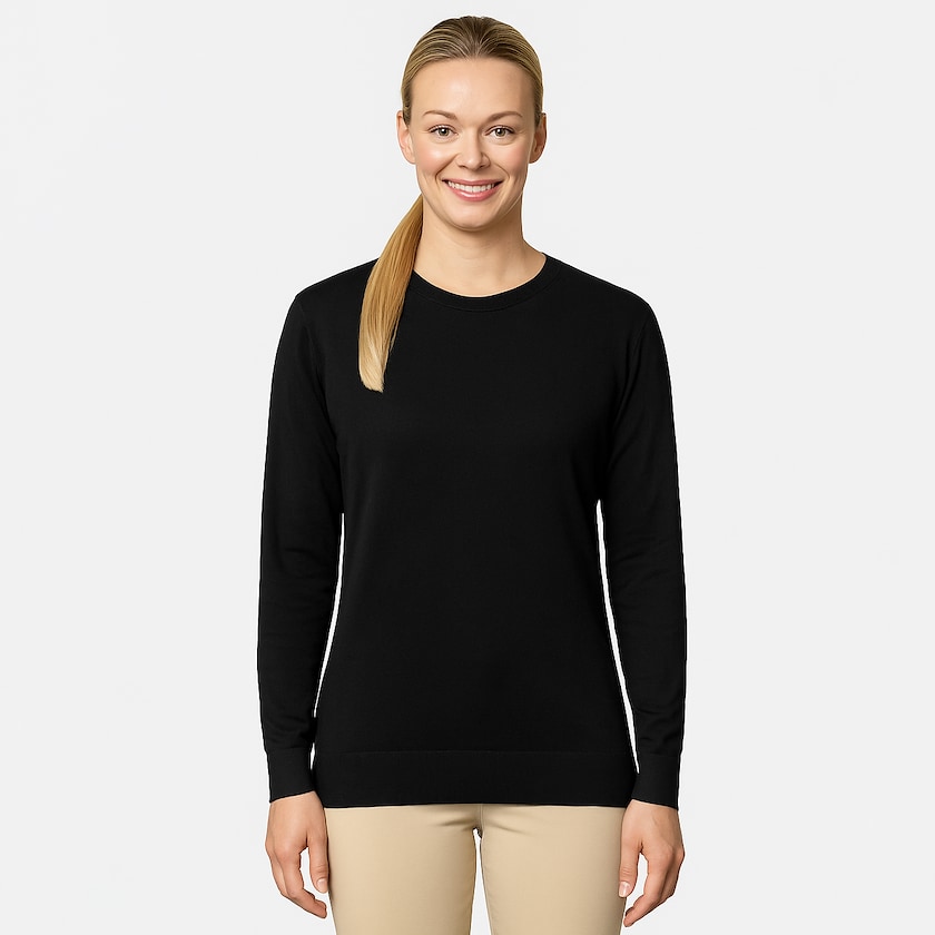 Feinstrick Damenpullover mit Rundhalsausschnitt. Der Pullover hat einen angenehm weichen Stoff aus 80% Viskose und 20% Nylon. Ihr Logo kann aufgestickt werden.
