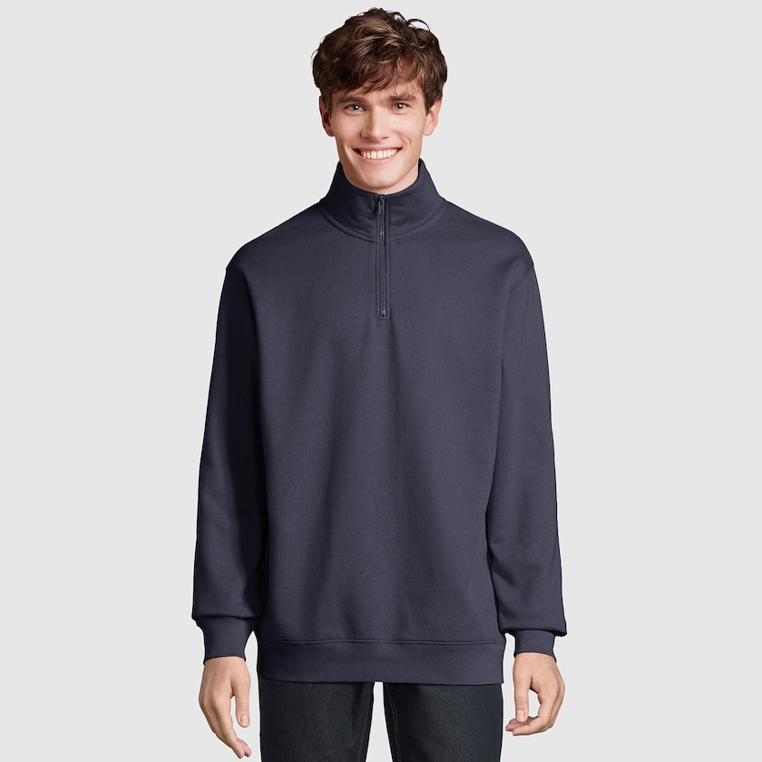 Sweatshirt von French SOL's mit einem kurzen Reißverschluss am Hals. Der Stoff besteht aus 80 % Baumwolle und 20 % GRS-zertifiziertem, recyceltem Polyester. Die Ausnahme ist die Farbe grau melange, die aus 73% Baumwolle, 20% recyceltem Polyester und 7% Viskose besteht.