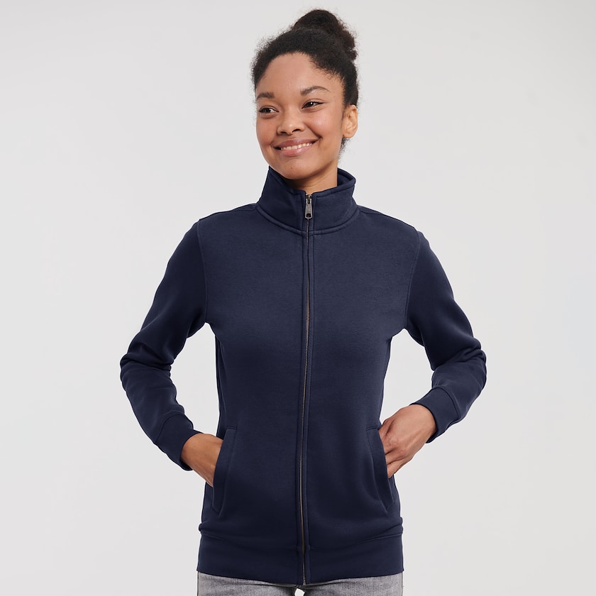 Sweatshirt mit durchgängigem Reißverschluss und geradem Schnitt. An den Seiten befinden sich Taschen. Die Markierung kann an der Brust mit Druck oder Stickerei erfolgen, oder am Rücken nur mit Druck. Gibt es auch als Herrenmodell.