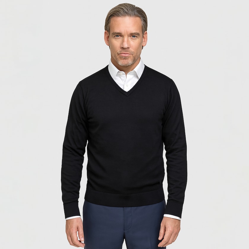 Strickpullover mit V-Ausschnitt. Der Pullover hat schicke Rippbündchen und ein zeitloses elegantes Design.