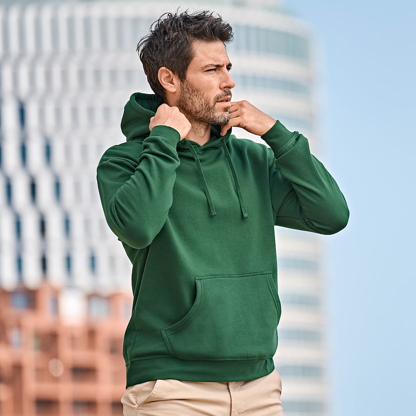 Hochwertiger Hoodie mit Logo von Tee Jays. Der Pullover besteht aus 70 % Bio-Baumwolle und 30 % Polyester. Der Stoff ist doppelt eingefärbt und die Bündchen angenehm elastisch dank Elasthananteil.