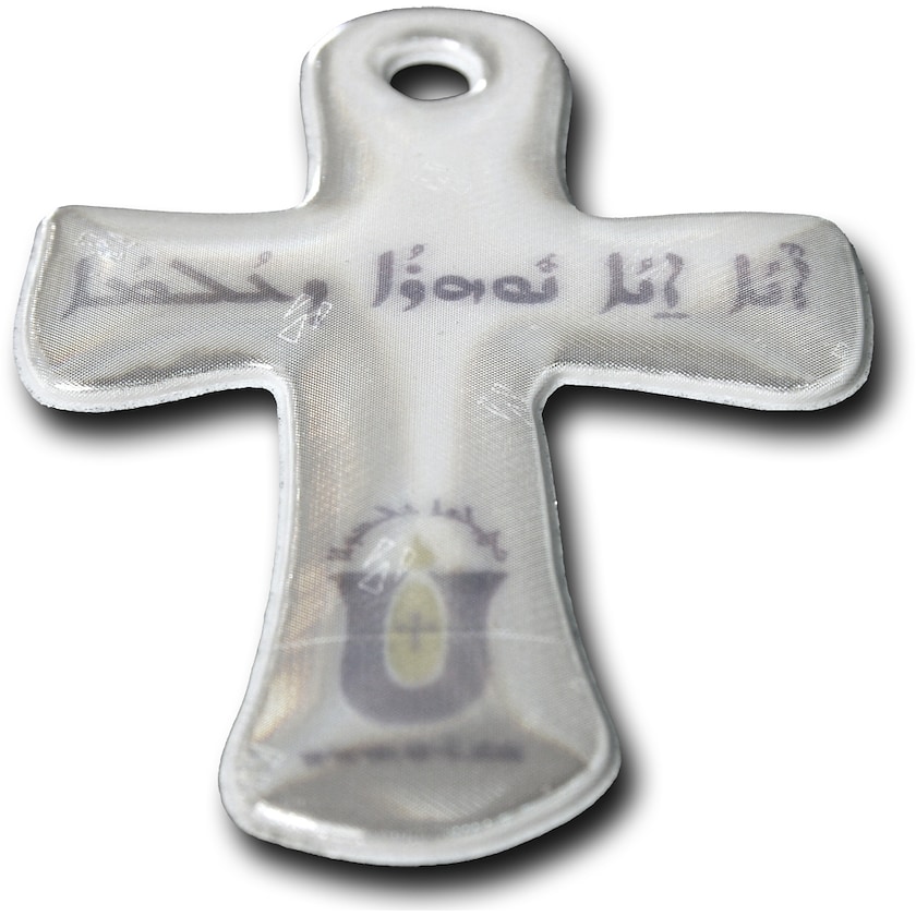 Weich-Reflektor in Form eines Kreuzes. Der Reflektor wird mit Schnur und Sicherheitsnadel oder mit Metallkette geliefert. Das Reflektormaterial ist geprüft und entspricht EN13356:2001. Um den Reflektor nicht zu beeinträchtigen, erfolgt der Druck unter der Oberfläche.