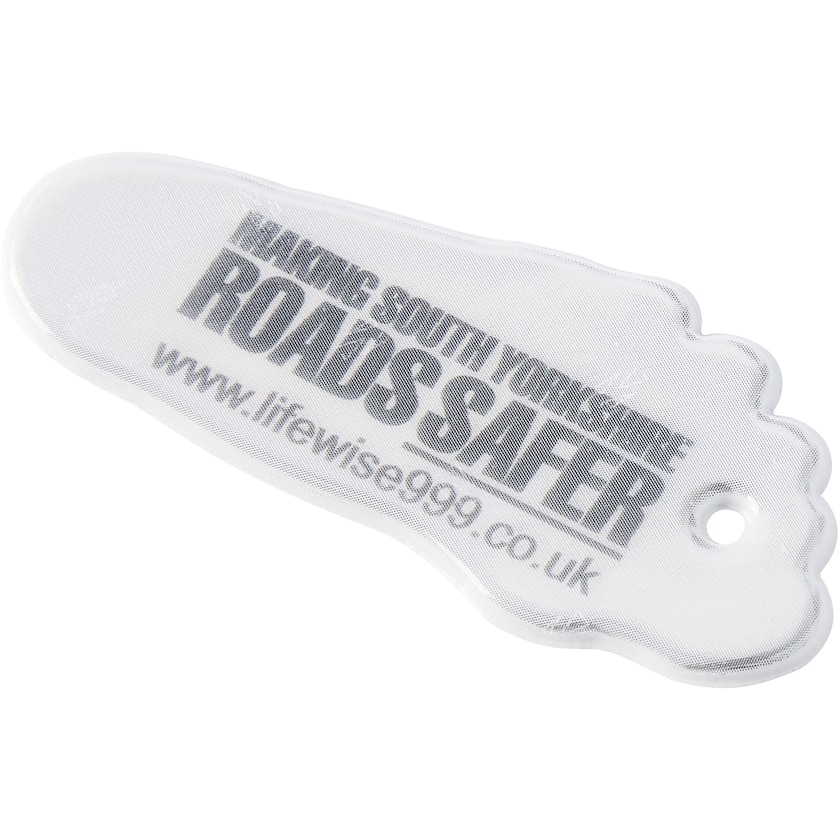 Weich-Reflektor in Form eines Fußes. Der Reflektor wird mit Schnur und Sicherheitsnadel oder mit Metallkette geliefert. Das Reflektormaterial ist geprüft und entspricht EN13356:2001. Um den Reflektor nicht zu beeinträchtigen, erfolgt der Druck unter der Oberfläche.