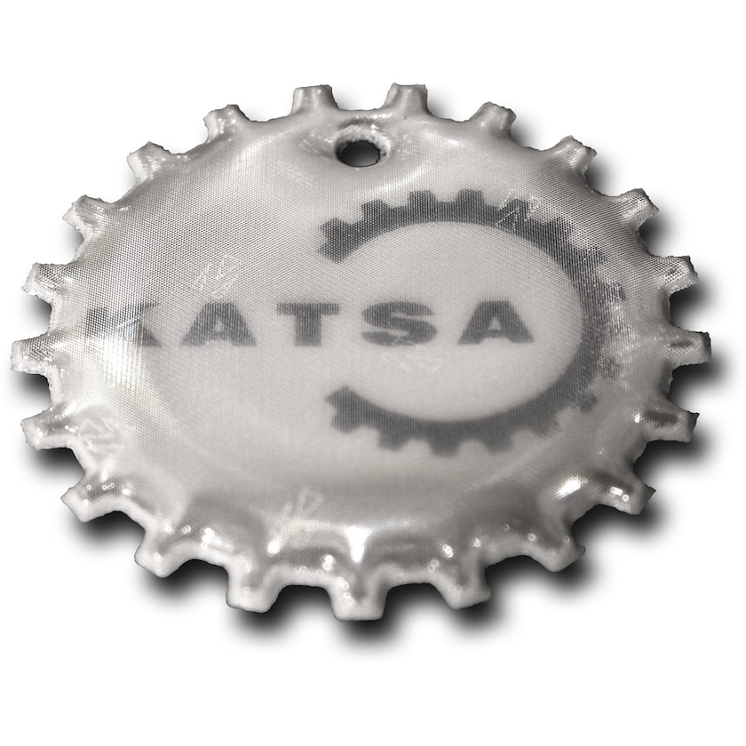 Weich-Reflektor in Form eines Zahnrads. Der Reflektor wird mit Schnur und Sicherheitsnadel oder mit Metallkette geliefert. Das Reflektormaterial ist geprüft und entspricht EN13356:2001. Um den Reflektor nicht zu beeinträchtigen, erfolgt der Druck unter der Oberfläche.