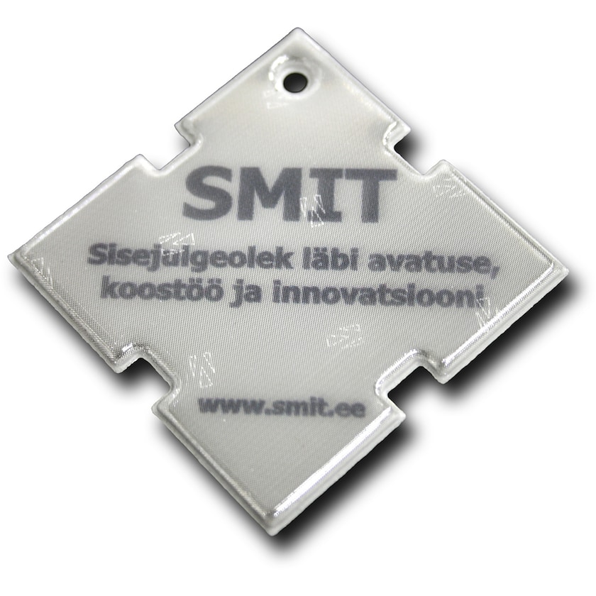 Charakteristischer Reflektor aus weichem Material. Der Reflektor wird mit Schnur und Sicherheitsnadel oder mit Metallkette geliefert. Das Reflektormaterial ist von 3M Scotchlite und entspricht EN13356:2001. Um den Reflektor in seinem Reflektiervermögen nicht zu beeinträchtigen, erfolgt der Druck unter der Oberfläche.