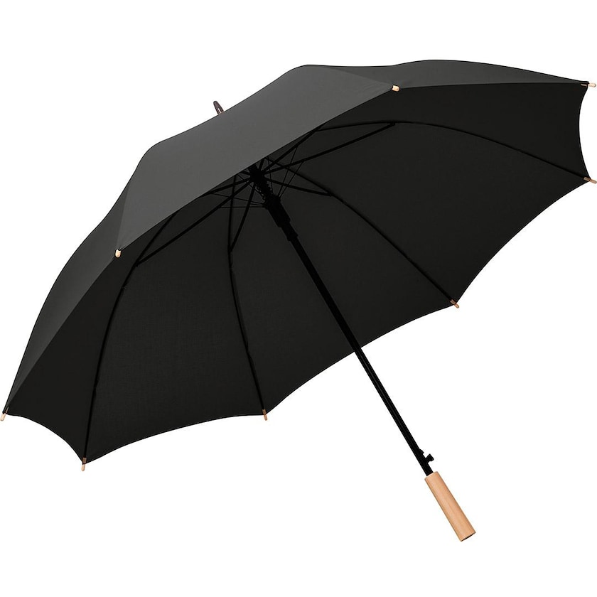 Hochwertiger und umweltfreundlicher Golfschirm. Der Schirm verfügt über eine verstärkte Konstruktion, die starken Windböen standhält. Der Stoff besteht aus recyceltem Polyester und der Griff aus Holz. Die Rippen bestehen aus Fiberglas und die Stange aus verzinktem Stahl.