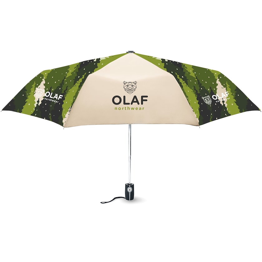 Umweltfreundlicher kompakter Regenschirm mit vollständig von Ihnen entworfenem Stoff. Davis hat 3 Segmente und ist von sehr hoher Qualität. Die Rippen sind aus Fiberglas. Der Regenschirm lässt sich automatisch öffnen und schließen. Der gesamte Stoff wird nach Ihren Wünschen bedruckt und anschließend auf die Schirmkonstruktion genäht. Wird mit einem Etui geliefert, das dem Design des Regenschirms entspricht.