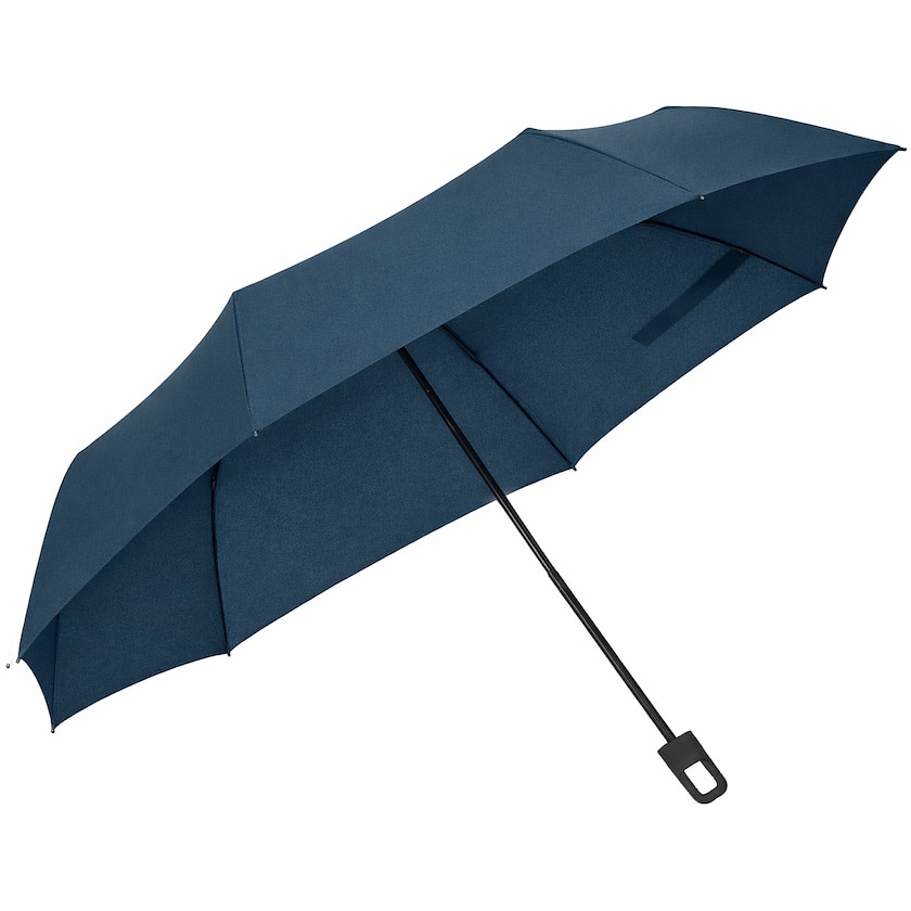 Praktischer Regenschirm mit Griff, der zugleich als Karabinerhaken dient. Modell Dunkinfield verfügt über drei Segmente und lässt sich manuell öffnen und schließen. Der Stoff besteht aus recyceltem rPET, die Stange aus Metall und die Speichen aus Glasfaser.