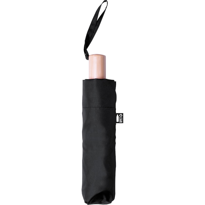 Umweltfreundlicher Sturmschirm im kompakten Format. Der Regenschirm hat eine Metallstange, Fiberglaslamellen und einen Holzgriff. Der Stoff besteht aus umweltfreundlichem rPET.
