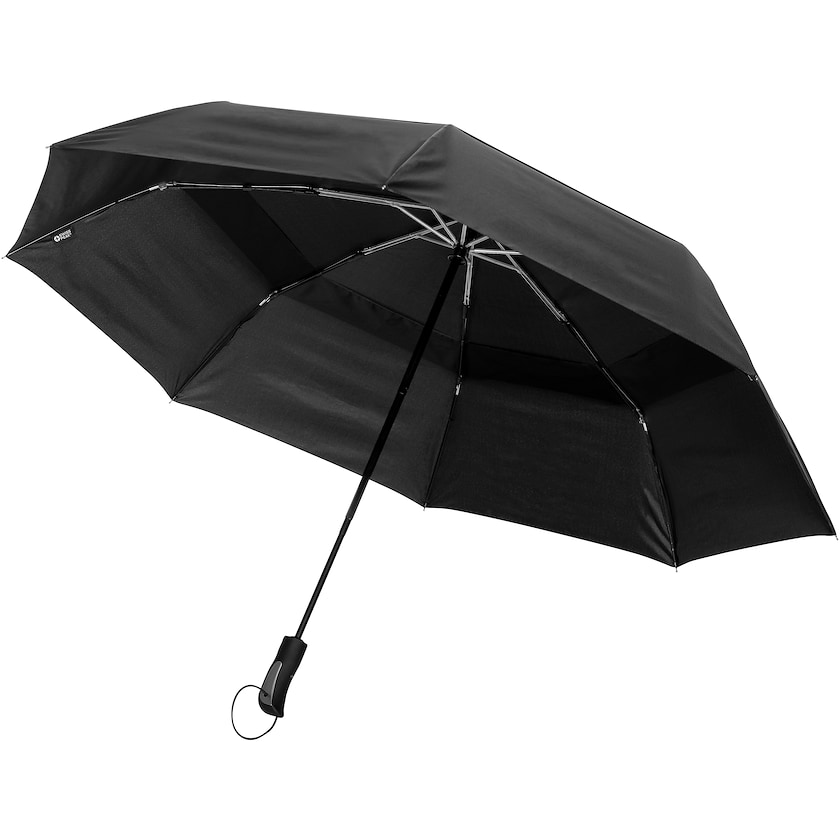 Umweltfreundlicher Regenschirm, der sturmsicher ist. Der Schirm hat eine Stange aus Aluminium und Rippen aus Fiberglas. Das Öffnen und Schließen erfolgt automatisch. Der Stoff besteht aus recyceltem Polyester.