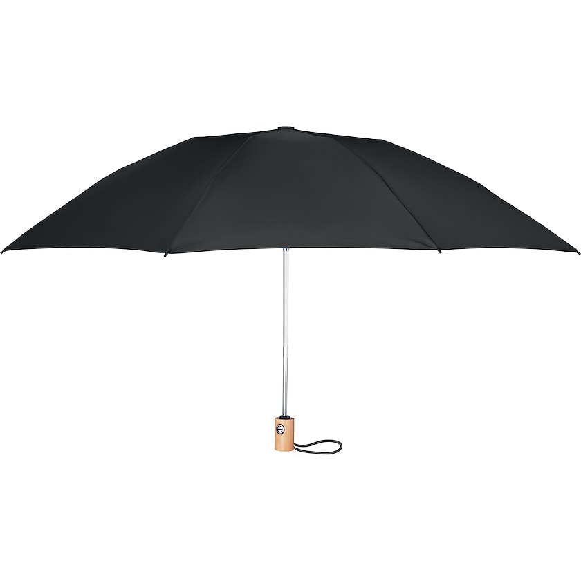 Umweltfreundlicher Kompaktregenschirm mit Druck. Der Stoff des Regenschirms besteht aus rPET, also recycelten PET-Flaschen. Der Griff besteht aus Bambus und die Rippen aus strapazierfähigem Fiberglas. Wird automatisch geöffnet und geschlossen.