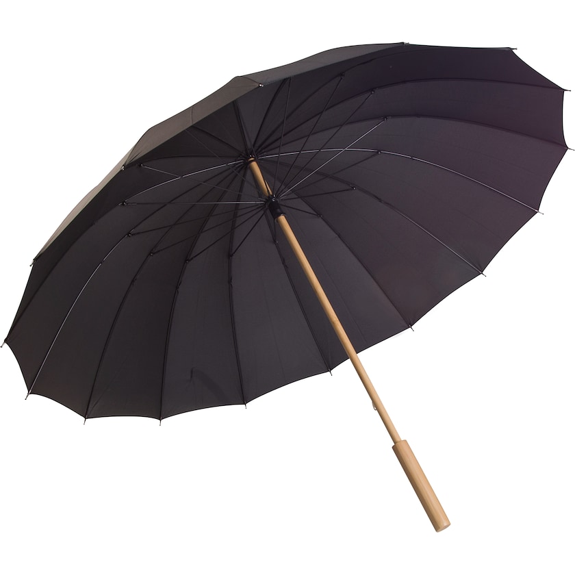 Umweltfreundlicher Sturmschirm mit Bambusdetails. Der Stoff besteht aus rPET, also recycelten PET-Flaschen. Die Schirmstange und der Griff bestehen aus Bambus und die Rippen sind aus Fiberglas. Der Regenschirm ist mit einem Etikett versehen, aus dem hervorgeht, dass der Stoff aus rPET besteht.