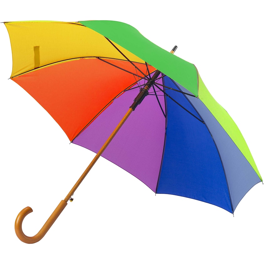 Automatischer Regenschirm mit regenbogenfarbenem Stoff. Der Griff besteht aus Holz und der Schirmstock sowie die Speichen sind aus Metall.