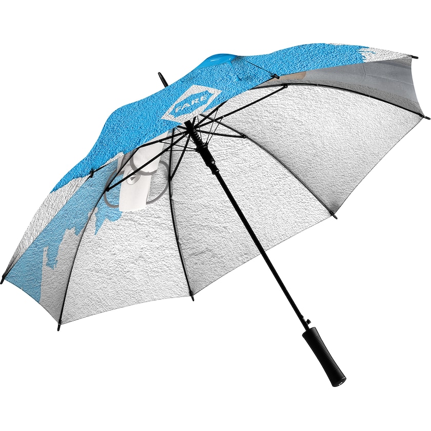 Hochwertiger Regenschirm mit Logo über die gesamte Oberfläche. Der Regenschirm hat eine verstärkte Konstruktion, die selbst starken Windböen standhalten kann. Die Streben bestehen aus Fiberglas und die Schirmstange aus verzinktem schwarzem Stahl. Die gesamte Stoffoberfläche wird ganz nach Ihren Wünschen bedruckt. Die Lieferzeit ist länger, da die Schirme auf Bestellung direkt im Werk gefertigt werden.
