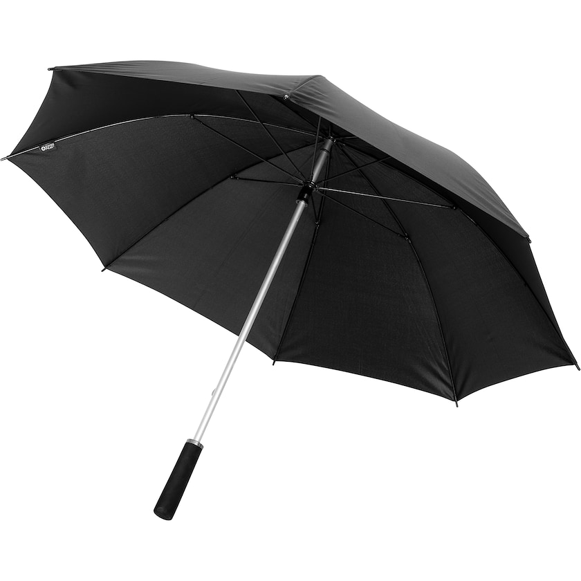 Ultraleichter, sturmsicherer Regenschirm mit umweltfreundlichem Stoff. Die Schirmstange besteht aus Aluminium und die Streben aus Fiberglas. Der Stoff besteht aus recyceltem Polyester.