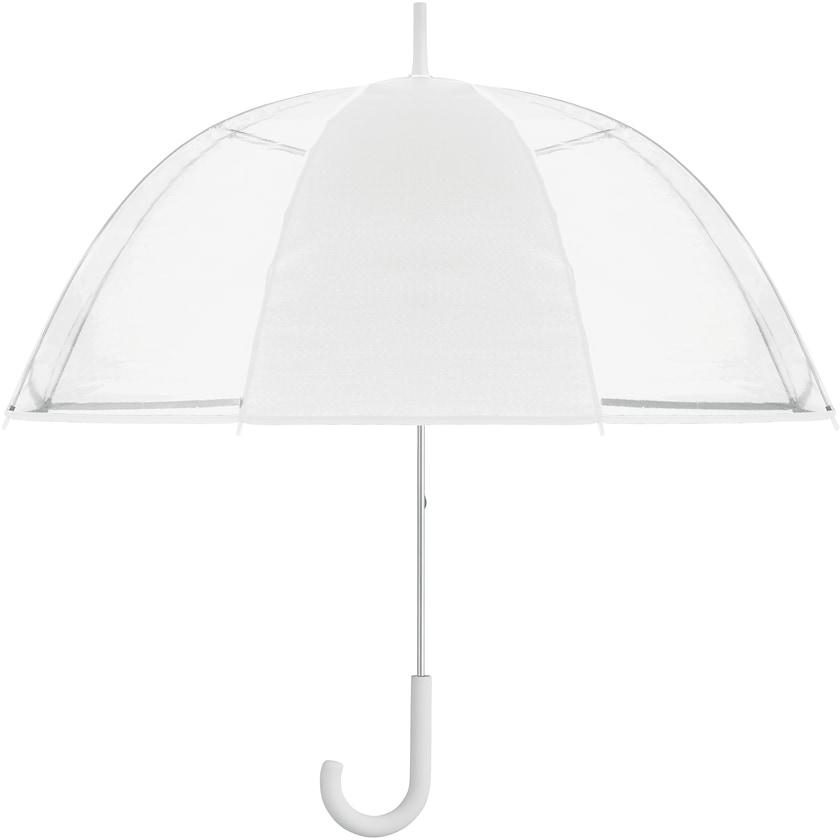 Transparenter Regenschirm mit einem einfarbigen Bereich. Der Griff ist aus Gummi gefertigt. Manuelles Öffnen und Schließen. Der Druck liegt auf dem durchgefärbten Bereich.