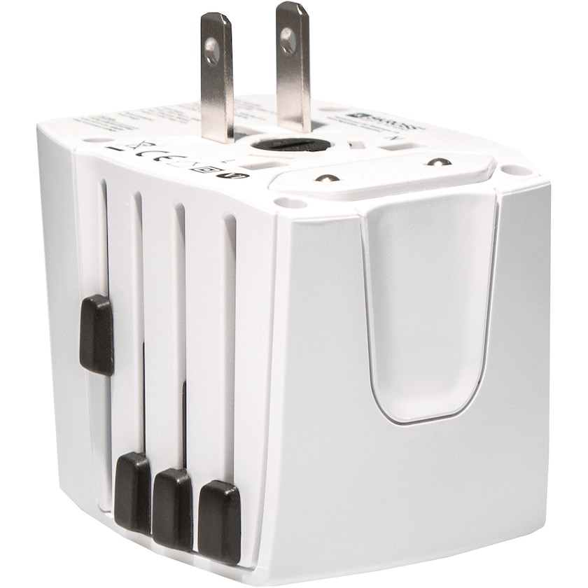 Kompakter Reiseadapter von Skoss mit zwei USB-Ausgängen. Ein Reiseadapter, der alle internationalen Sicherheitsstandards und Normen erfüllt. Kindersicher. Lieferung in einer eleganten Produktverpackung mit aufgedruckter Anleitung. Ein perfektes Werbegeschenk für Kunden, die viel reisen!