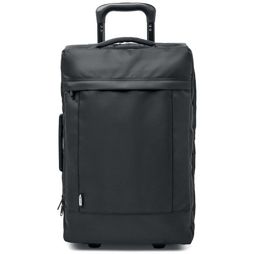 Aufwendiger Trolley mit umweltfreundlichem Stoff. Auf der Vorderseite befindet sich eine Reißverschlusstasche und innen zwei Reißverschlusstaschen. Der Trolley hat ein Zahlenschloss und Griffe an der Oberseite, der Seite und der Unterseite.