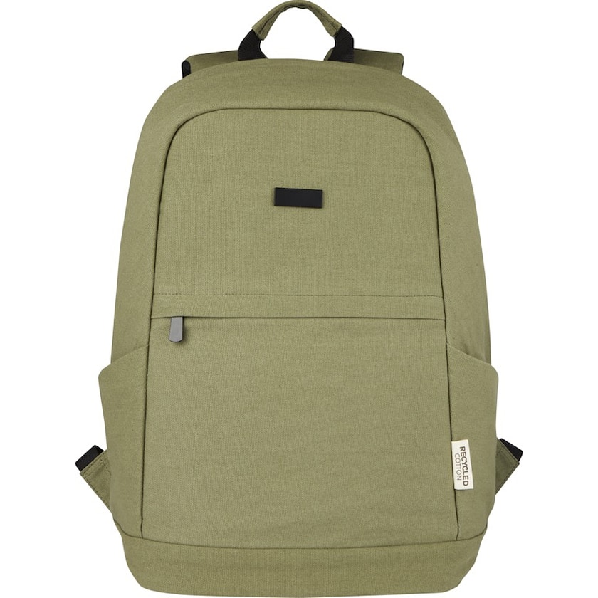 Computerrucksack aus recyceltem Material. Im Inneren befindet sich ein gepolstertes Fach für einen 15,6 Zoll Laptop. Der Rucksack besteht aus recyceltem Canvas und rPET. Die Kennzeichnung kann entweder durch Druck, Lasergravur oder Stickerei erfolgen.