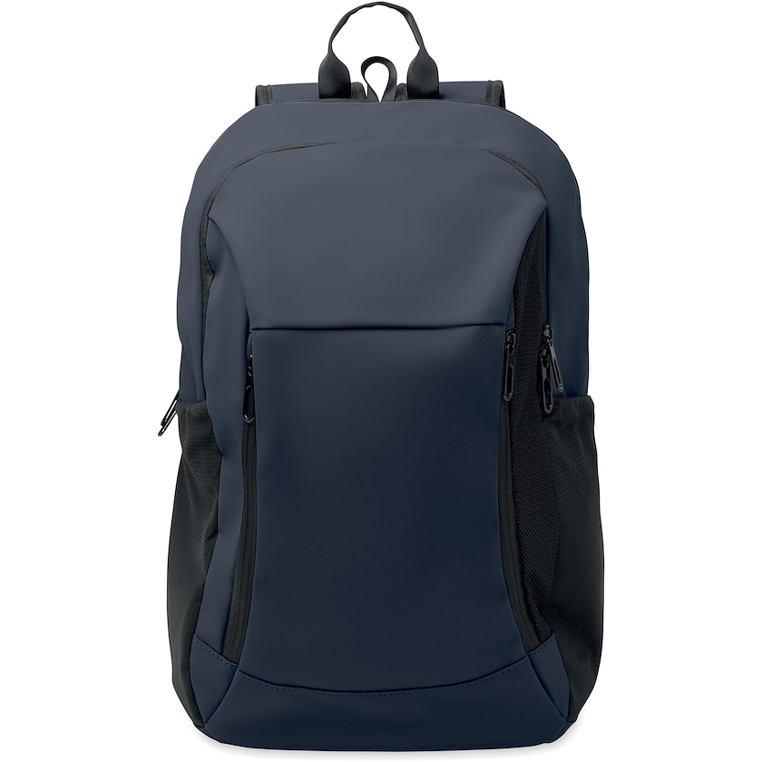 Rucksack aus weichem Material. Im Inneren befindet sich ein Fach für einen 15-Zoll-Laptop. Der Reißverschluss des Hauptfachs ist verdeckt, was das Diebstahlrisiko verringert. An den Seiten befinden sich Netztaschen. Die Rückseite und die Schultergurte sind gepolstert. Beim Bedrucken ist nur eine Farbe möglich.