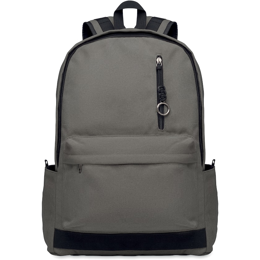 Computerrucksack aus recyceltem Baumwollstoff. Im Inneren befindet sich ein Fach für einen 15-Zoll-Laptop. Vorne befindet sich eine große Reißverschlusstasche und an den Seiten befinden sich Taschen ohne Reißverschluss.