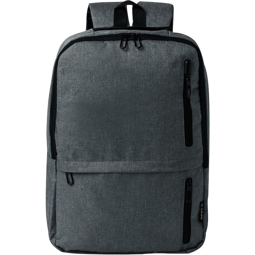 Umweltfreundlicher rPET-Computerrucksack. Im Inneren befindet sich ein gepolstertes Fach für einen 15-Zoll-Laptop und ein 10-Zoll-Tablet. Rücken- und Schultergurte sind gepolstert.