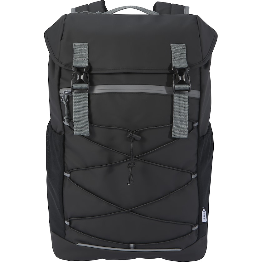 Computerrucksack mit wasserabweisendem Stoff aus recyceltem Polyester. Im Inneren befindet sich ein Fach für einen 15,6-Zoll-Laptop. Auf der Vorderseite befindet sich eine Tasche mit Reißverschluss. Der Rücken und die Schultergurte sind schön gepolstert.