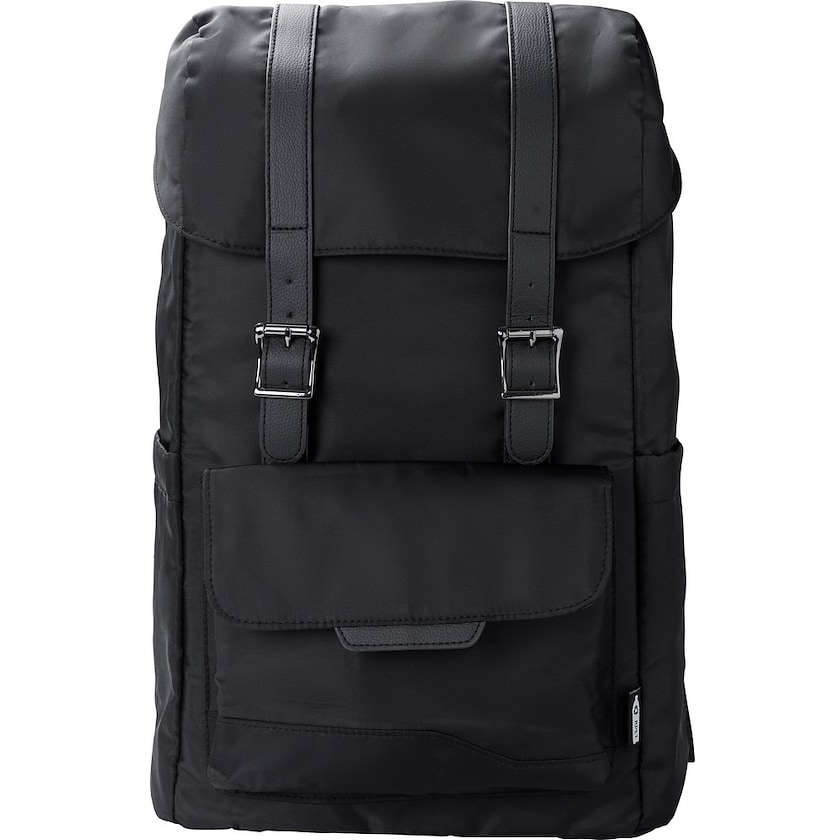 Retro-inspirierter Computerrucksack aus recyceltem, wasserabweisendem Stoff. Im Inneren befindet sich ein gepolstertes Fach für einen 15-Zoll-Laptop. Der Deckel wird mit einem Magnetverschluss geschlossen gehalten.
