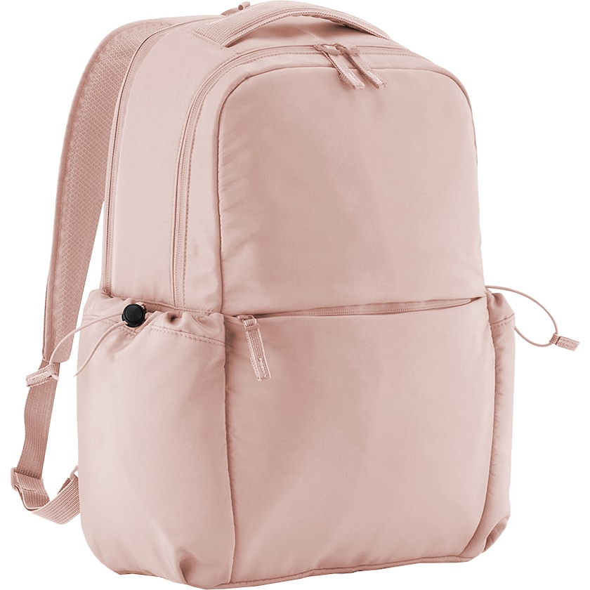 Computerrucksack für Damen. Der Rucksack besteht zu 100 % aus GRS-zertifiziertem Polyester, das nach Control Union CU811033 zertifiziert ist. Im Inneren befindet sich ein gepolstertes Fach für einen 16-Zoll-Laptop. Vorne befindet sich eine Tasche mit Reißverschluss. An den Seiten befinden sich Taschen mit Kordelzugverschluss.