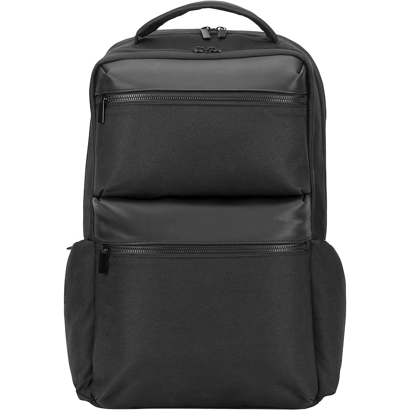 Computer-Rucksack aus wasserabweisendem Material. Auf der Vorderseite befinden sich zwei große Reißverschlusstaschen, an den Seiten zwei kleinere. Die Rückseite ist zusätzlich gepolstert. Im Inneren bietet der Rucksack ein gepolstertes Fach für einen 17,3-Zoll-Laptop. Außen- und Innenmaterial bestehen aus recyceltem Polyester.