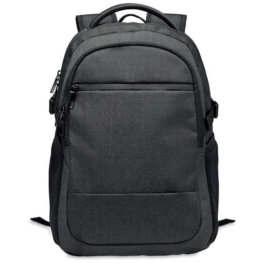 Umweltfreundliche Computertasche für einen 15-Zoll-Laptop. Der Rucksack besteht aus recyceltem Polyester (rPET). An den Seiten befinden sich zwei Netztaschen. Der Rücken ist gepolstert und belüftet. Die Schultergurte sind gepolstert.