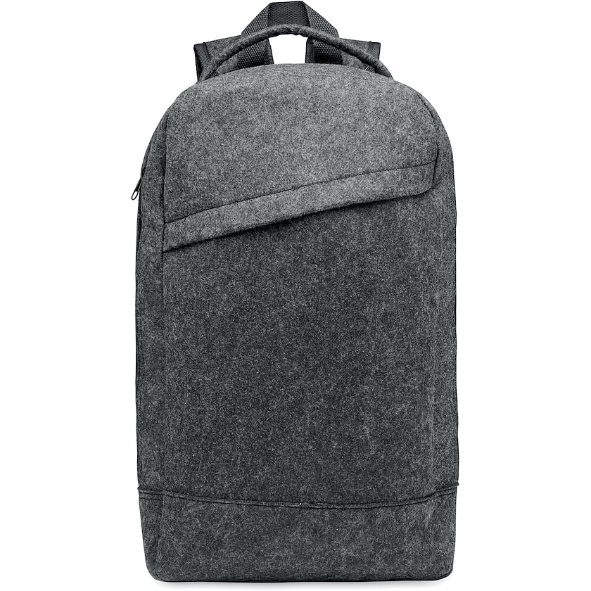 Umweltfreundlicher Computer-Rucksack aus Filz. Im Inneren befindet sich ein gepolstertes Fach für einen 13-Zoll-Laptop. Der Filzstoff besteht aus rPET, also recycelten PET-Flaschen. Auf der Rückseite befindet sich eine Reißverschlusstasche für Wertsachen.