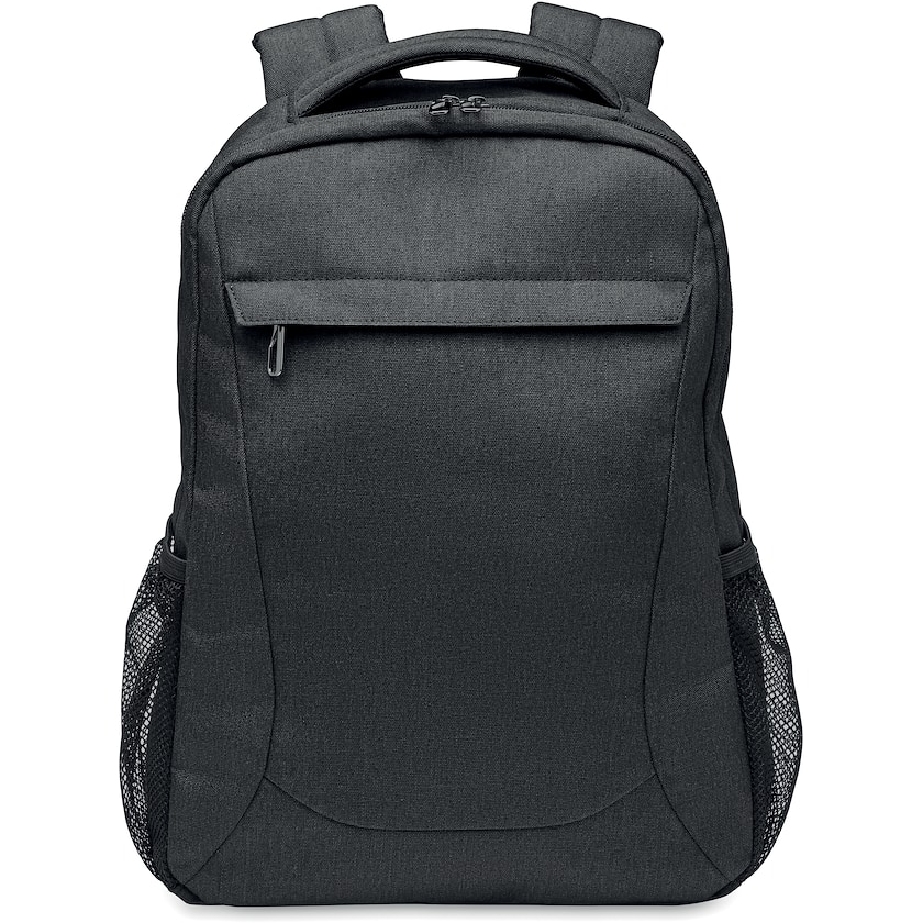 Computerrucksack aus recyceltem Material. Im Inneren befinden sich ein gepolstertes Fach für einen 16-Zoll-Laptop und mehrere kleinere Innentaschen. Auf der Vorderseite befindet sich eine Reißverschlusstasche und an den Seiten Netztaschen. Auf der Rückseite des Rucksacks befindet sich ein Trolley-Gurt.