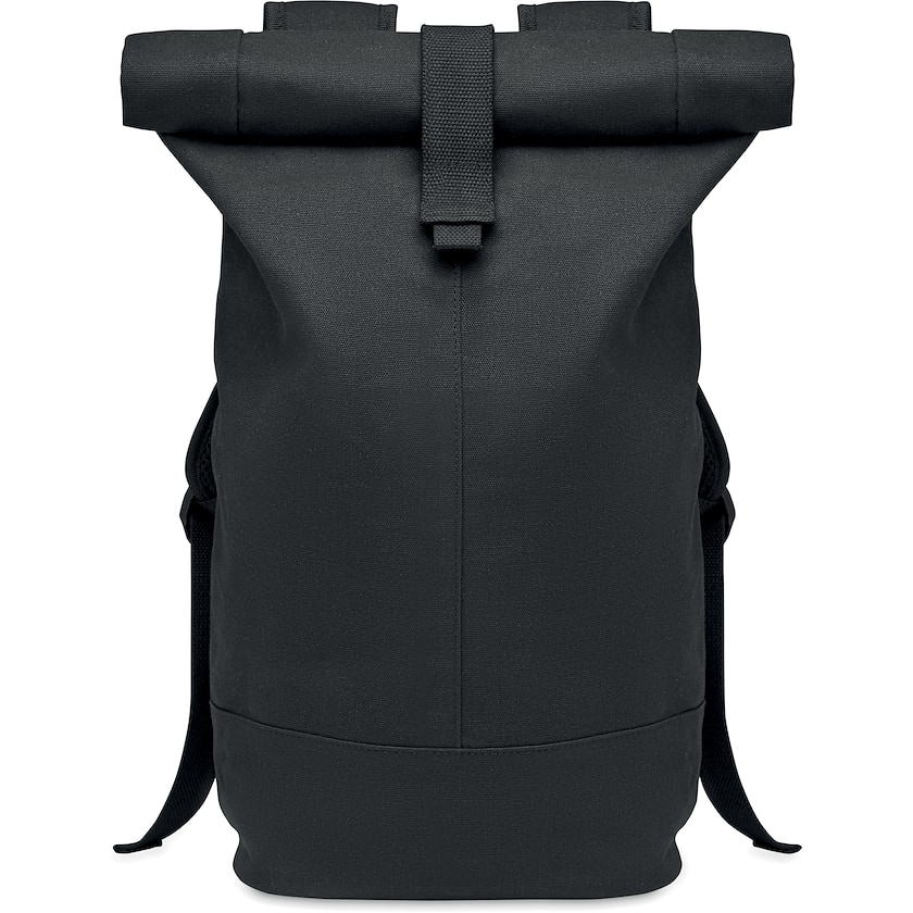 Rolltop-Rucksack aus schwarzem Canvas-Stoff. Der Stoff des Rucksacks wiegt ganze 340 Gramm/m². Die Rückwand des Rucksacks ist für erhöhten Tragekomfort gepolstert. Das Futter besteht aus umweltfreundlichem rPET.