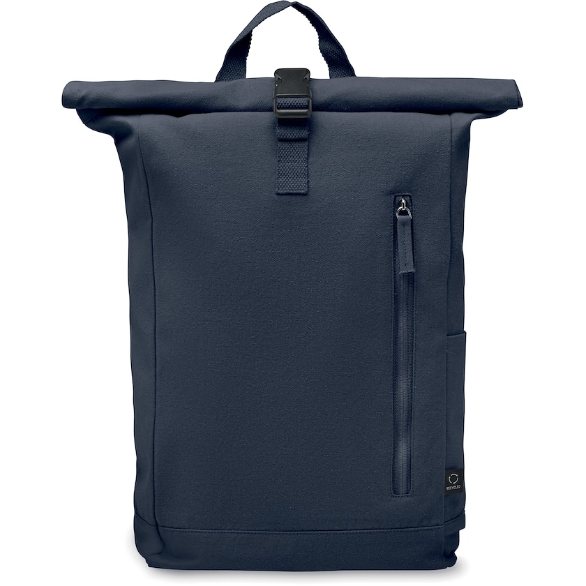 Umweltfreundlicher Rolltop-Rucksack aus strapazierfähigem Baumwollmischgewebe. Der Stoff besteht aus 80 % Baumwolle und 20 % recyceltem Polyester. Auf der Vorderseite befindet sich eine Reißverschlusstasche. Auf einer Seite befindet sich eine kleinere Tasche.