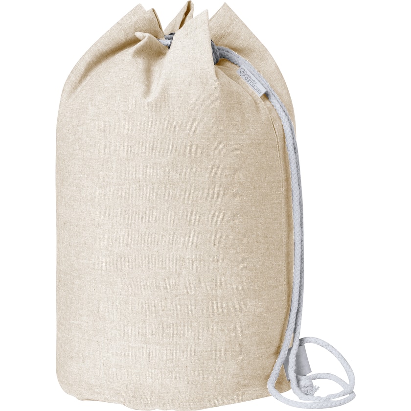 Seesack aus recycelter Baumwolle. An der Seite befindet sich ein Etikett, das darauf hinweist, dass der Seesack aus recycelter Baumwolle besteht.