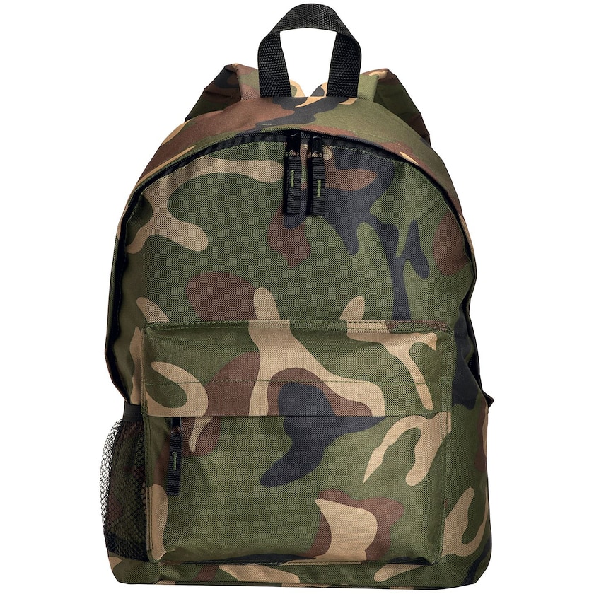 Camouflagefarbenen Rucksack bedrucken. Neben dem Hauptfach gibt es noch eine Fronttasche mit Reißverschluss. An einer Seite befindet sich eine Netztasche. Rückwand und Schultergurte sind gepolstert. Es ist nur 1-farbiger Druck möglich.