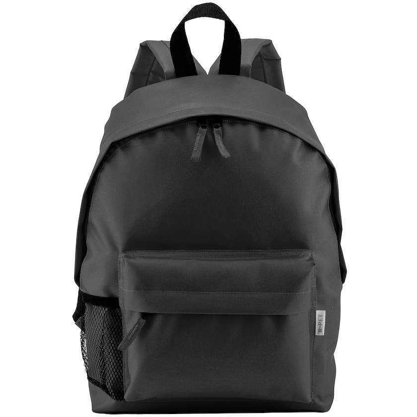 Erschwinglicher Rucksack aus umweltfreundlichem rPET. Die Rückseite ist gepolstert und an den Seiten befinden sich Netztaschen für Wasserflaschen.