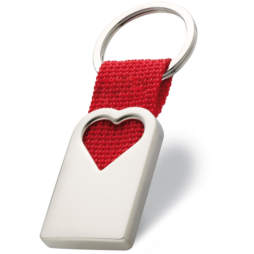 Herzförmiger Schlüsselanhänger aus Metall. Der Schlüsselanhänger hat eine matte Oberfläche und wird in einer schwarzen Papierschachtel geliefert.