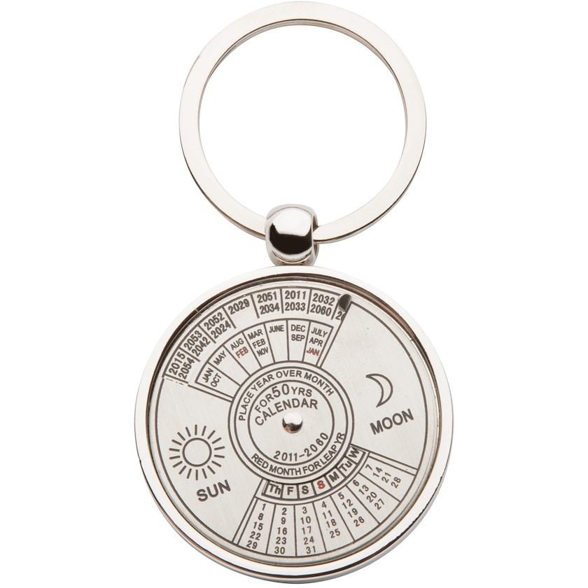 Schlüsselanhänger aus Metall mit rotierendem Kalender. Der Kalender reicht bis in das Jahr 2060. Wird in schwarzer Schachtel geliefert. Ein schönes, zeitloses Geschenk!