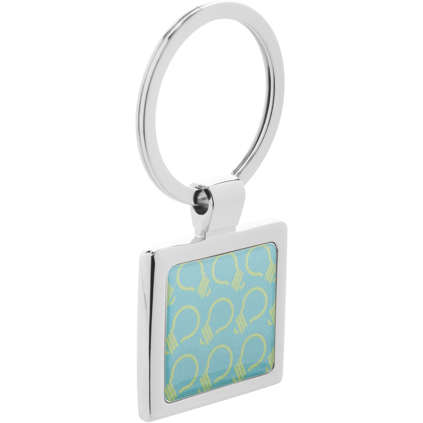Quadratischer Metallschlüsselanhänger mit 4-Farbdruck. Schlüsselanhänger aus Chrom mit großer Druckfläche. Kommt in schicker Geschenkschachtel.