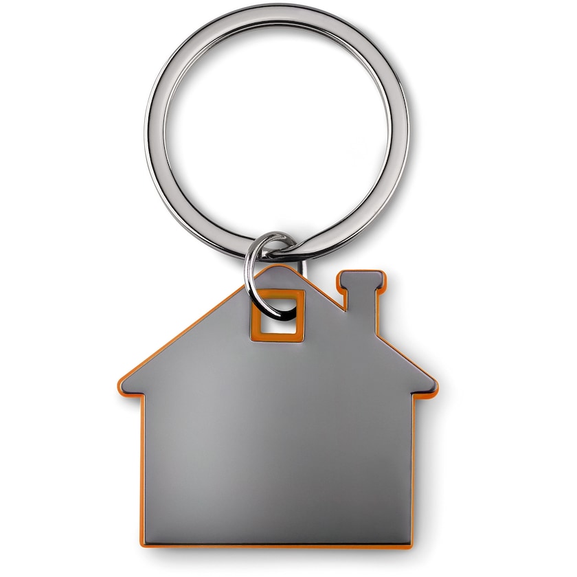 Hausförmiger Schlüsselanhänger aus Edelstahl und Kunststoff. Ideal für zB Makler und Immobilienunternehmen. Die Personalisierung erfolgt wahlweise mit 1-farbigem Druck oder Lasergravur.