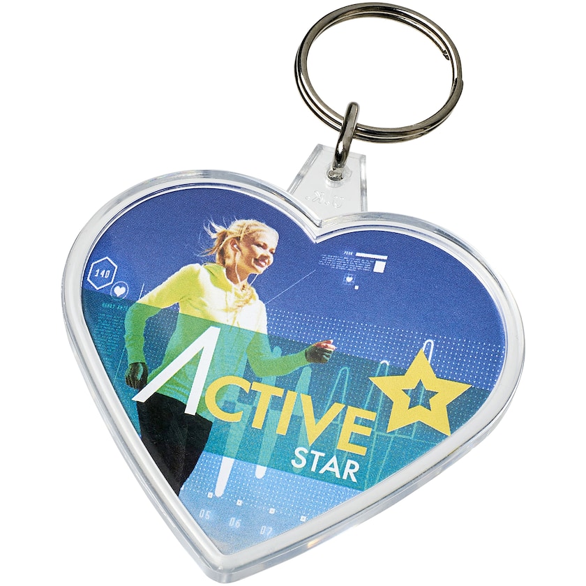 Herzförmiger Schlüsselanhänger aus umweltfreundlichem Material. Der Schlüsselanhänger besteht aus dem umweltfreundlichen Material GPPS. Der Druck erfolgt auf beiden Seiten eines Blattes Papier, das in die GPPS-Hülle des Schlüsselanhängers gelegt wird. Der Druck kann auf beiden Seiten unterschiedlich sein. Der Schlüsselanhänger wird in Europa hergestellt.