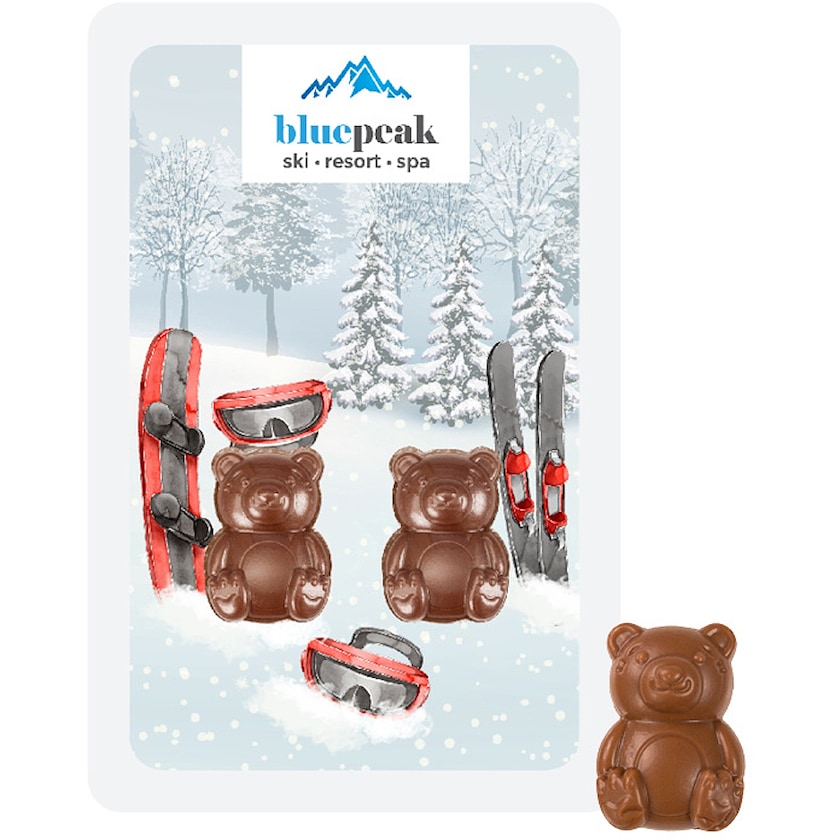 Zwei süße Bären aus Milchschokolade in Blisterkarte. Der Karte wird im 4-Farb-Fotodruck nach ihren Wünschen bedruckt. Alle Kinder lieben sie!