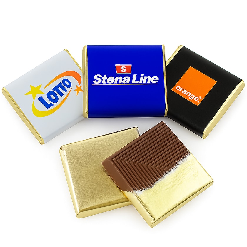 Belgische Qualitätsschokolade mit 4-Farbdruck. Ab 500 Stück bestellbar. Der Papierumschlag wird nach Ihren Wünschen mit 4-Farbdruck versehen. Kurze Lieferzeit!