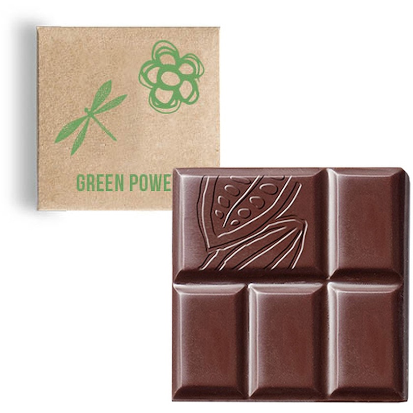 20 g erstklassiger Schokolade in einer Verpackung aus recyceltem Papier. Die Verpackung wird mit Digitaldruck in CMYK bedruckt. Die Verpackung kann auch nach Pantone offsetbedruckt werden (siehe Artikel 17237). Die Schokolade ist von höchster Qualität und wird für maximale Lebensmittelhygiene vakuumverpackt.