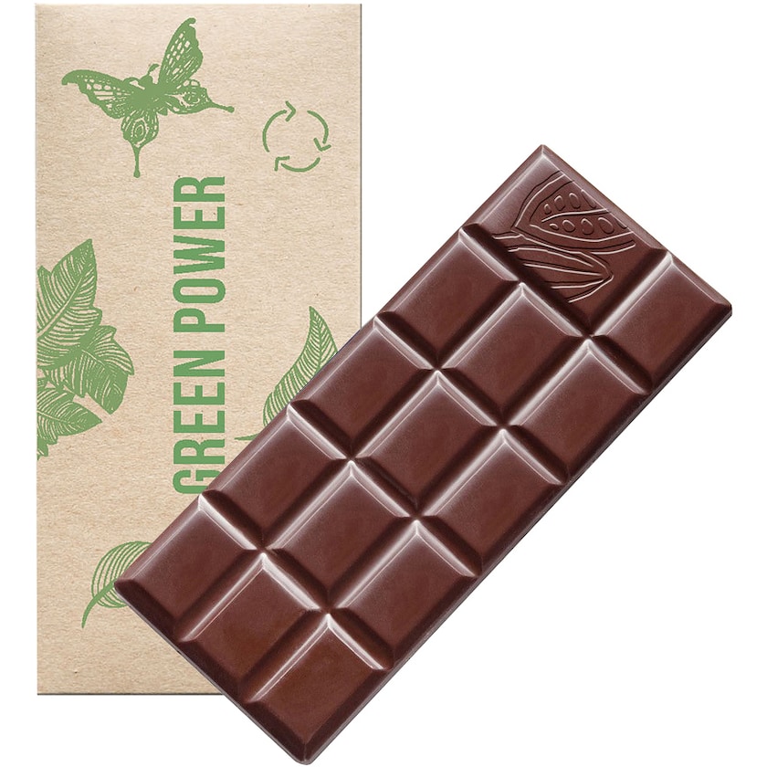 50 g Schokolade bester Qualität in einer Verpackung aus recyceltem Papier. Die Verpackung wird mit Digitaldruck in CMYK bedruckt. Die Verpackung kann auch nach Pantone offsetbedruckt werden (siehe Artikel 17235). Die Schokolade ist von höchster Qualität und wird für maximale Lebensmittelhygiene vakuumverpackt.